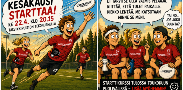 Kiinnostaako sinua urheilu? Oletko harrastanut ennen aktiivisesti jotain urheilulajia? Haluaisitko kilpailla? Pidätkö juoksemisesta ja hyppäämisestä? Oletko joukkueurheilija? Miltäpä korviisi kuulostaa kaiken tämän lisäksi hyvä seura ja hauskanpito? Jos viimeisen kysymyksen lisäksi vastasit kyllä yhteenkään kysymykseen kyllä, olet meidän etsimämme lisä Continue reading Disquitos etsii uusia pelaajia!